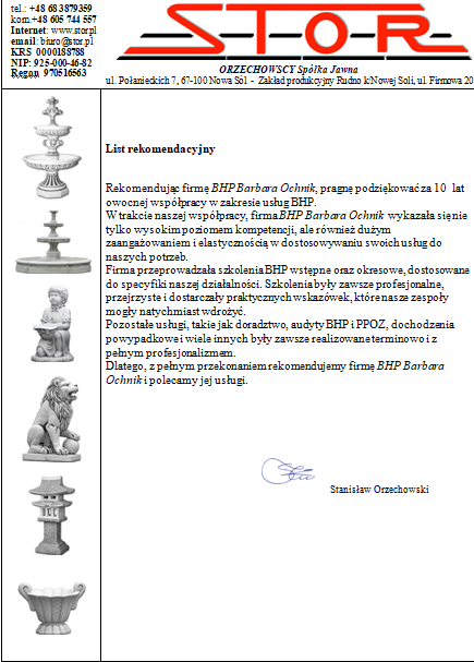 Instrukcje BHP, procedury BHP, rejestry czynników szkodliwych lub niebezpiecznych, wypadków przy pracy, dokumentacja ergonomii stanowisk pracy, plan działań w sytuacjach awaryjnych i wiele innych.